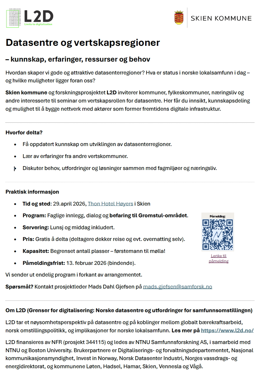 Skien and L2D will host a meeting on the topic of good data center regions and municipalities, on April 29, 2026. The event will be in Norwegian and is open to local and regional actors and others interested in the topic.